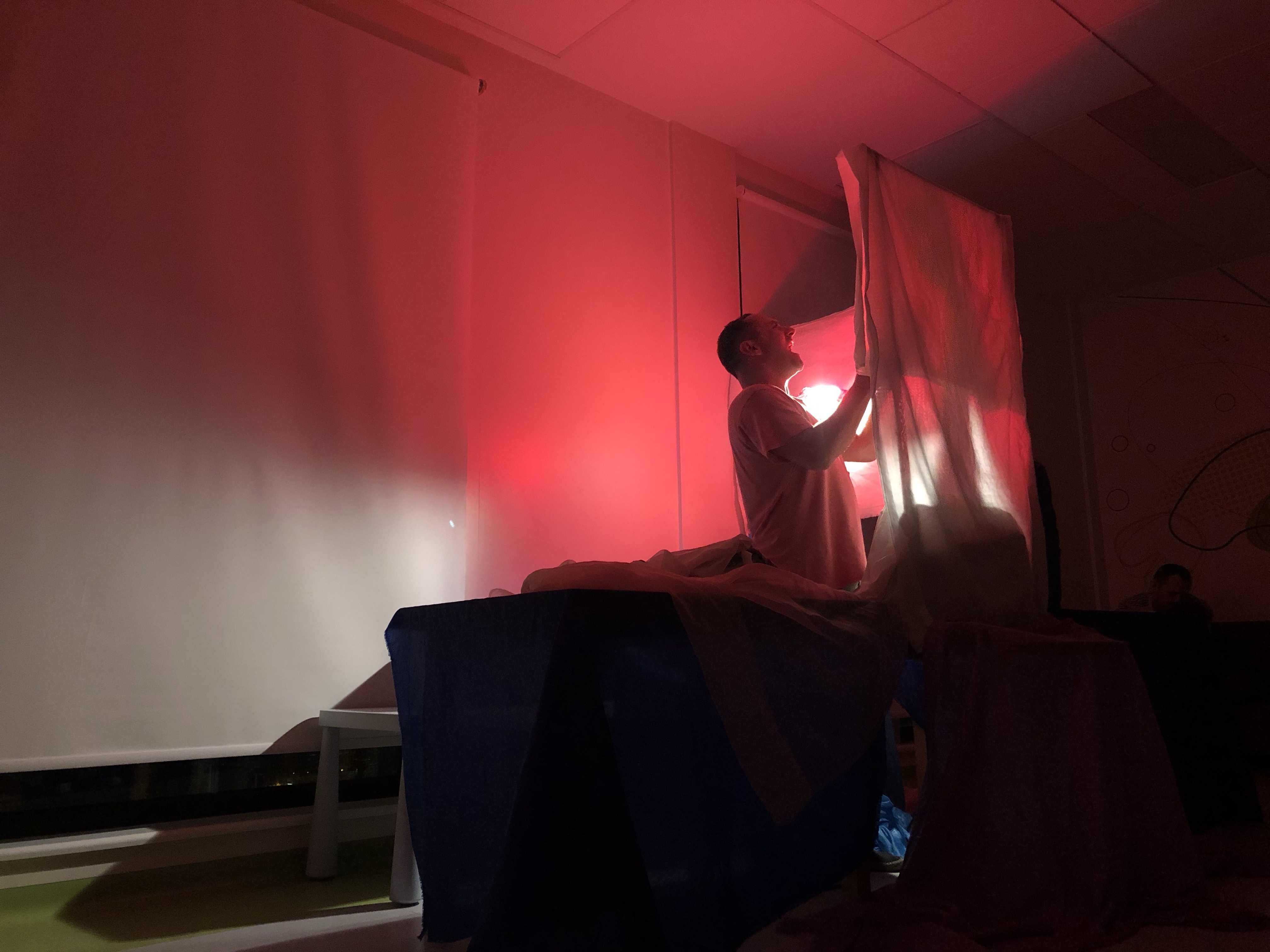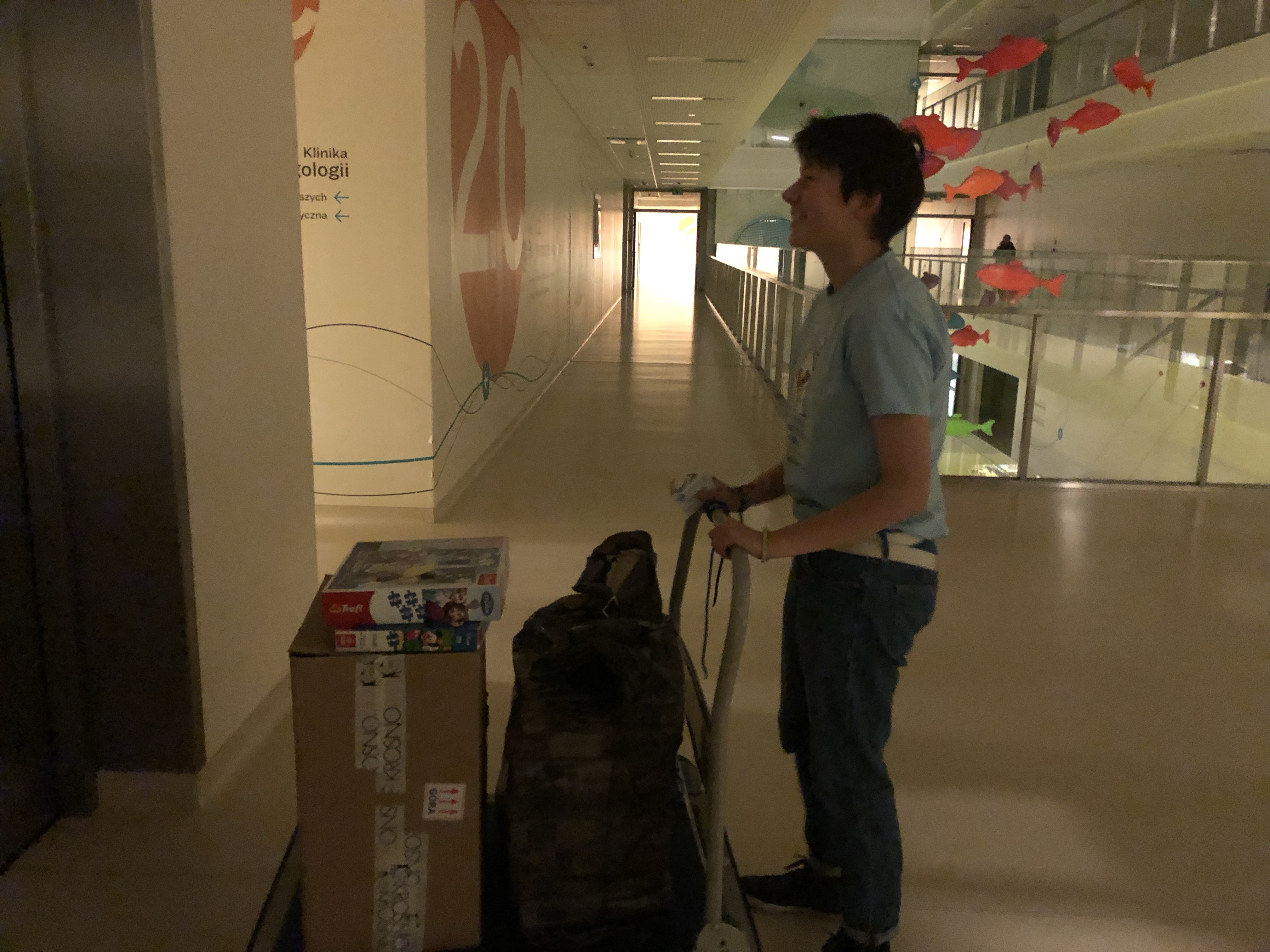 This time as we visited the hospital, there was a small shadow theatre going on. The story that was being told was „The Ugly Duckling” from Hans Christian Andersen. All the kids were really interested in the play and kept focused on the action. The idea to do it with shadows attracts children even more. Maybe some of them see similar performance for the first time, so it surely catches their attention. After the play kids were able to come up „behind-the-scenes” and look at all the props. There were also some Halloween themed ones, that caused furore among children. It was very rewarding to see those kids so happy at the moment playing with the ghost and pumpkin shadows and being so fascinated. Our job was to do some photos during the play and after that we were also delivering new games or books to social play rooms in different wards.