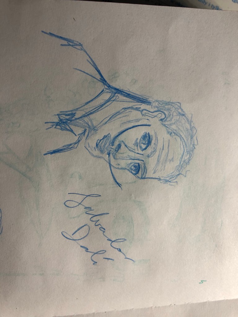 For my this time’s drawing I created an image of Salvador Dali, a famous painter. I have recently got socks with Salvador Dali and some details from his works, like the well-known fluid clocks or elephants with very long legs. I was inspired by this gift and googled Salvador Dali to refresh some knowledge. I have found this really famous photo of him and decided to depict it in my sketchbook. This also served as a part of my human drawing experience. This time I made the sketch with a blue pencil.