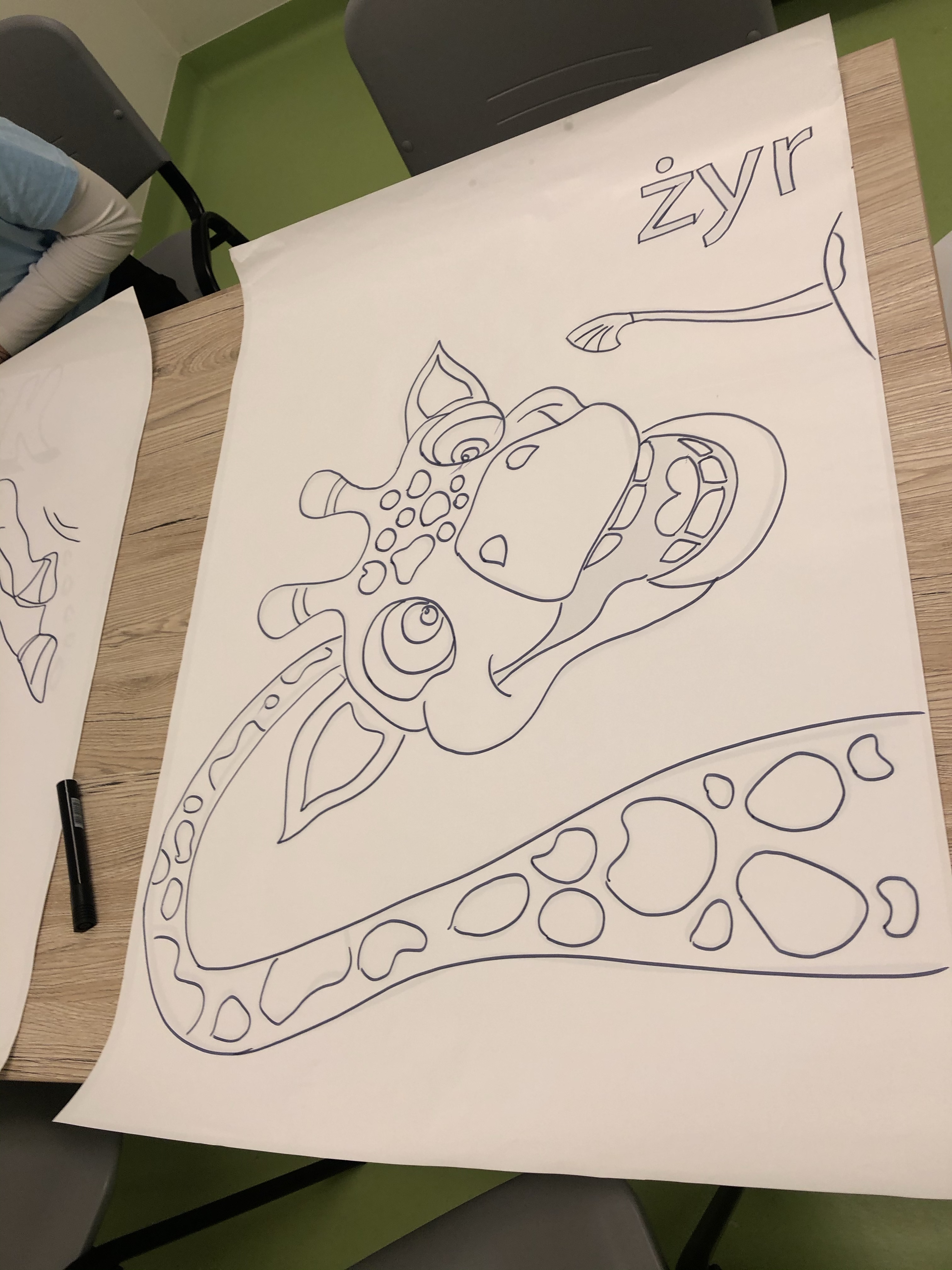 This time we’ve got to make pictures for a „colouring wall”. We were redrawing some designs that are later hung for kids to colour. Right now different animals, including some dinosaurs, are a popular design for those drawings. I was tracing a flamingo in a scarf, a happy giraffe and a t-rex with a cylinder hat. The whole job of redrawing images for colouring is a really relaxing process and is not quite demanding. Yet, it is great to see that children later colour those designs and have fun with that, unleashing their creativity by the way.