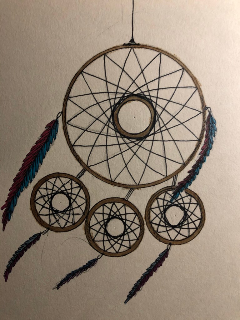 This time I have decided to add a bit of colour to my work, as I have been recently using mostly a pencil alone. This drawing depicts a dreamcatcher and I have chosen to draw one, because of the possibility to experiment with colour. I always thought that dreamcatchers were kind of peaceful and calming in the way they move on the wind, so I wanted mine to also be waving.