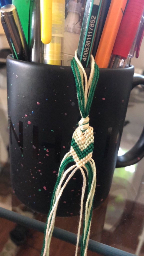 For this time’s Creativity I have done something different than drawing. I have made a bracelet using strings. My younger cousin have taught me how to do such things a year ago when we were spending holiday together in Wilga. This bracelet I have made for a friend of mine, and I have already a few more „orders” for them.