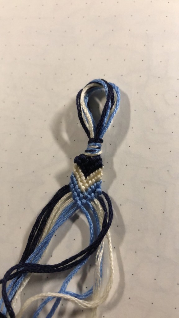 For this creativity assignment I again did a string bracelet. Similarly to the last one, this was also made as a gift for a friend. Yet, this time I chose a slightly different colour set and went more with different shades of blue and white. I first learned to do this about a year ago and am hopefully getting better at it.
